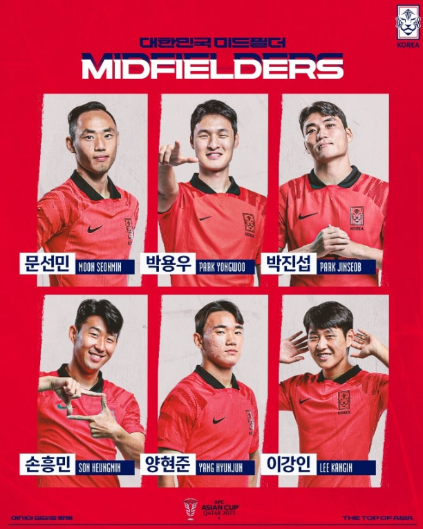 - 미드필더 : 박용우, 황인범, 박진섭, 홍현석, 이순민, 이재성, 손흥민, 이강인, 정우영, 양현준, 황희찬, 문선민