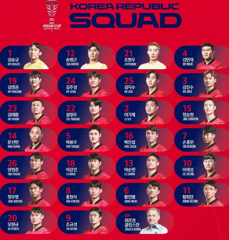 2023 아시아축구연맹(AFC) 아시안컵에서 64년 만의 우승을 노리는 대한민국 축구 국가대표 출전명단명단은 아래와 같습니다.