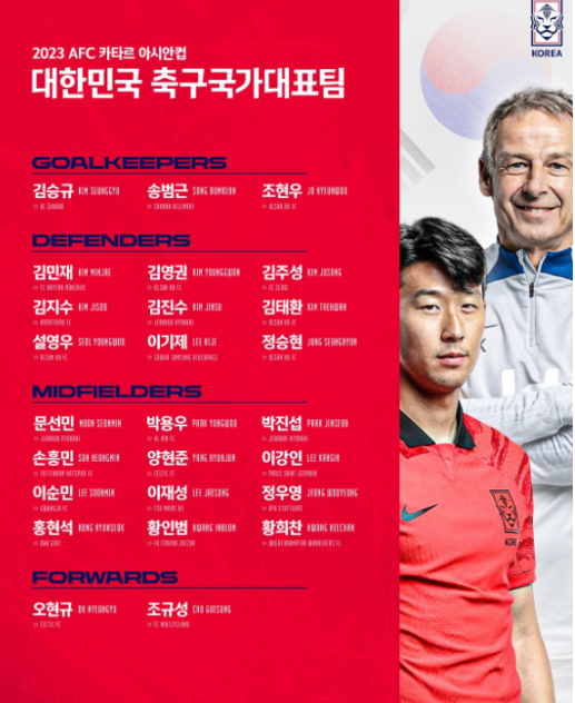 2023 아시아축구연맹(AFC) 아시안컵에서 64년 만의 우승을 노리는 대한민국 축구 국가대표 출전명단명단은 아래와 같습니다.
