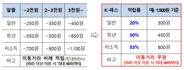 기존의 알뜰교통카드는 지원조건(이동거리 요건, 전용 App 설치·작동)을 충족하기 불편하고, 교통비 정액지원으로 대중교통요금 인상 시 실질효과가 저하되는 문제점이 있었습니다.